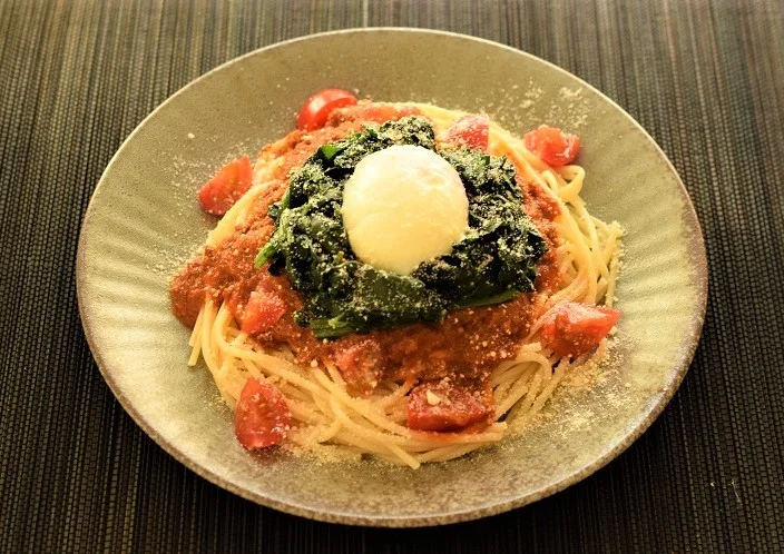 ④スパゲティーを皿に盛り、ミートソースをかける。ホウレン草をのせ、上に温泉卵をのせる。プチトマトと粉チーズを散らす。