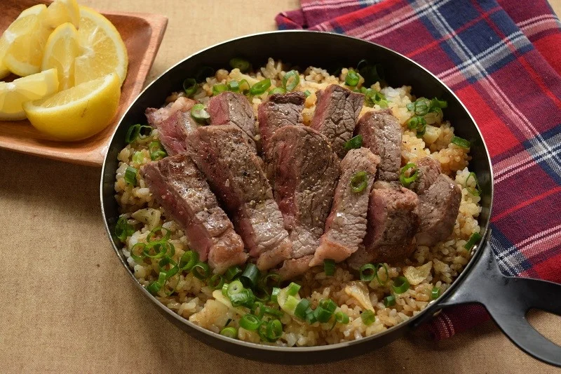 おうちでごちそうを食べるなら、タンパク質や亜鉛、鉄分が多い牛肉を、シンプルに焼いて食べるのがおすすめ。カルビやハラミなどの脂肪分が多い焼肉より、赤身部分を選べるステーキは満足感がある割にヘルシーです。赤身の肉を選味付けは塩コショウのみなので、塩はしっかり振りましょう。レモンをかけると、ボリュームあるお肉もさっぱりいただけますし、ビタミンCがとれて、鉄分の吸収も助けてくれます。牛肉の旨みを吸ったガリバタライスと一緒に食べると元気が沸いてきますよ。