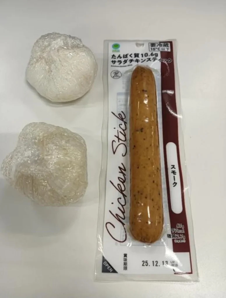 おにぎりと合わせてスティックタイプのサラダチキンをセレクト。この商品で10.6gのたんぱく質を摂取できるそう。