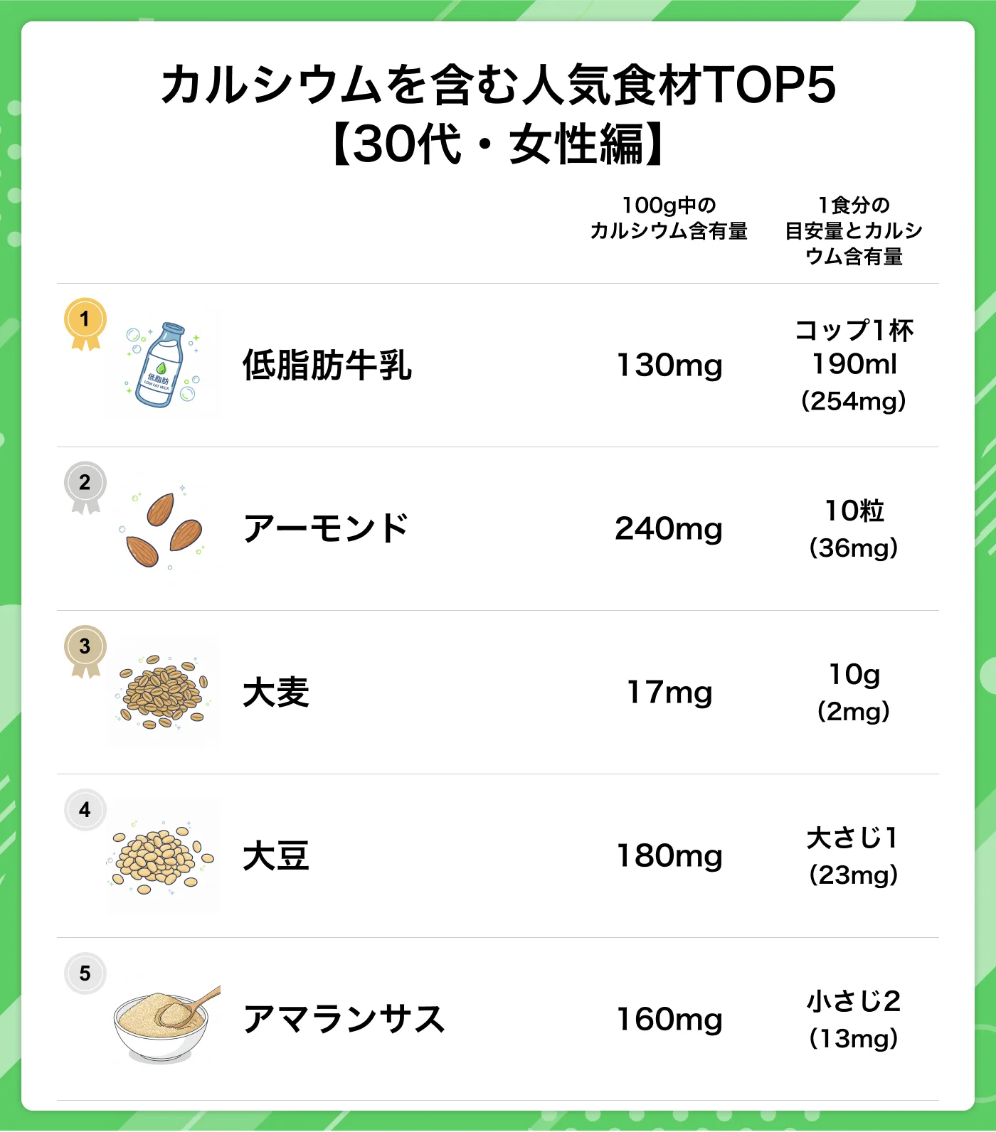 1位の低脂肪牛乳は料理や飲み物に加えたりと、幅広いシーンで手軽にカルシウム摂取量が増やせそうですね。5位のアマランサスはアンデスで古くから栽培されている穀物。「スーパーグレイン(驚異の雑穀)」とも呼ばれています。