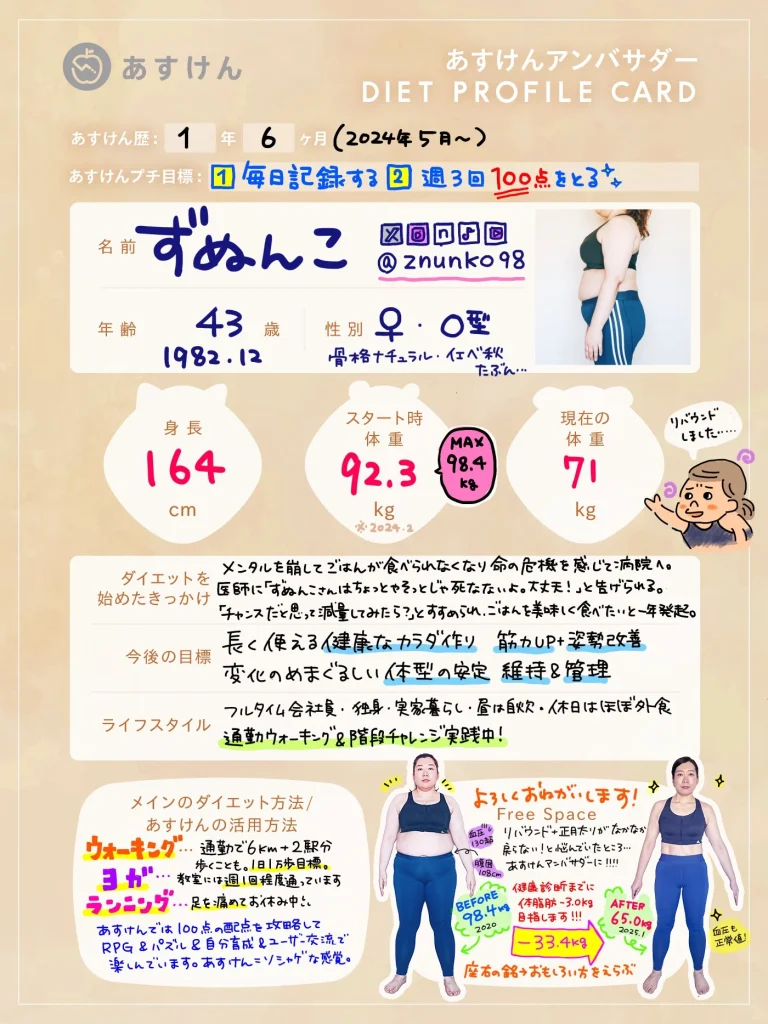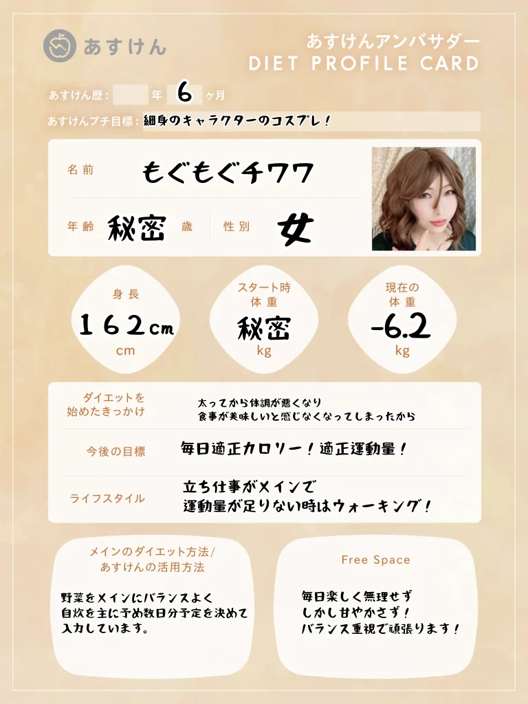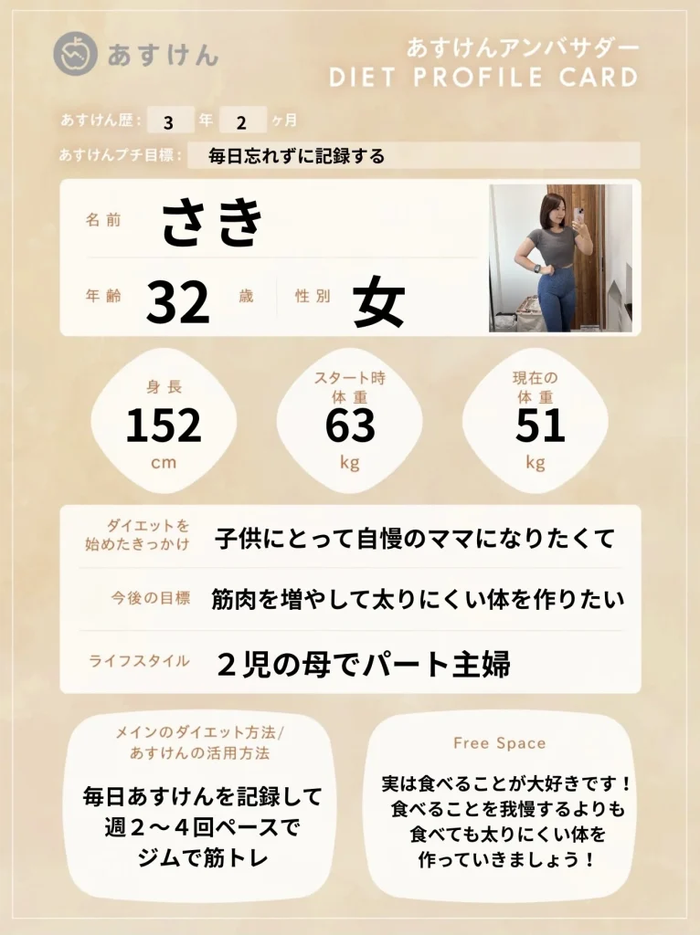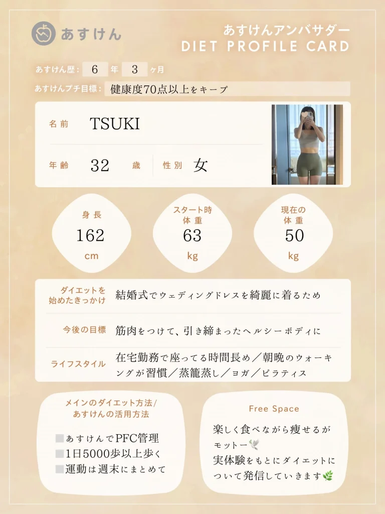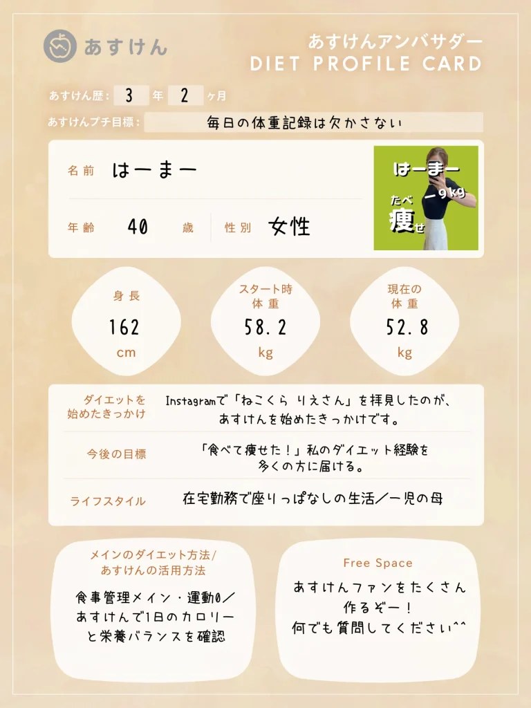 それぞれのSNSアカウントから、あすけんを活用したリアルな食事記録やダイエットの工夫、日々の暮らしを発信していきます。ぜひフォローして、一緒に楽しく健康作りを頑張りましょう!