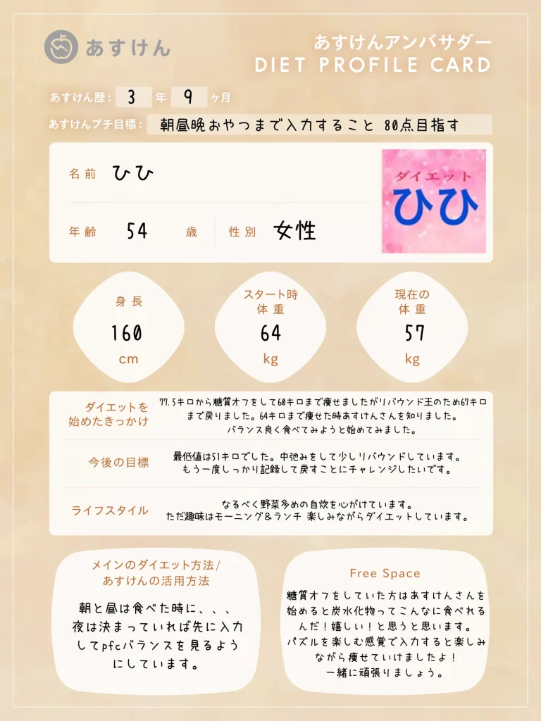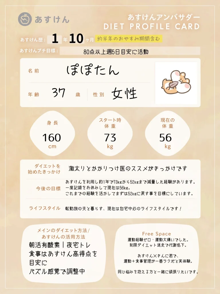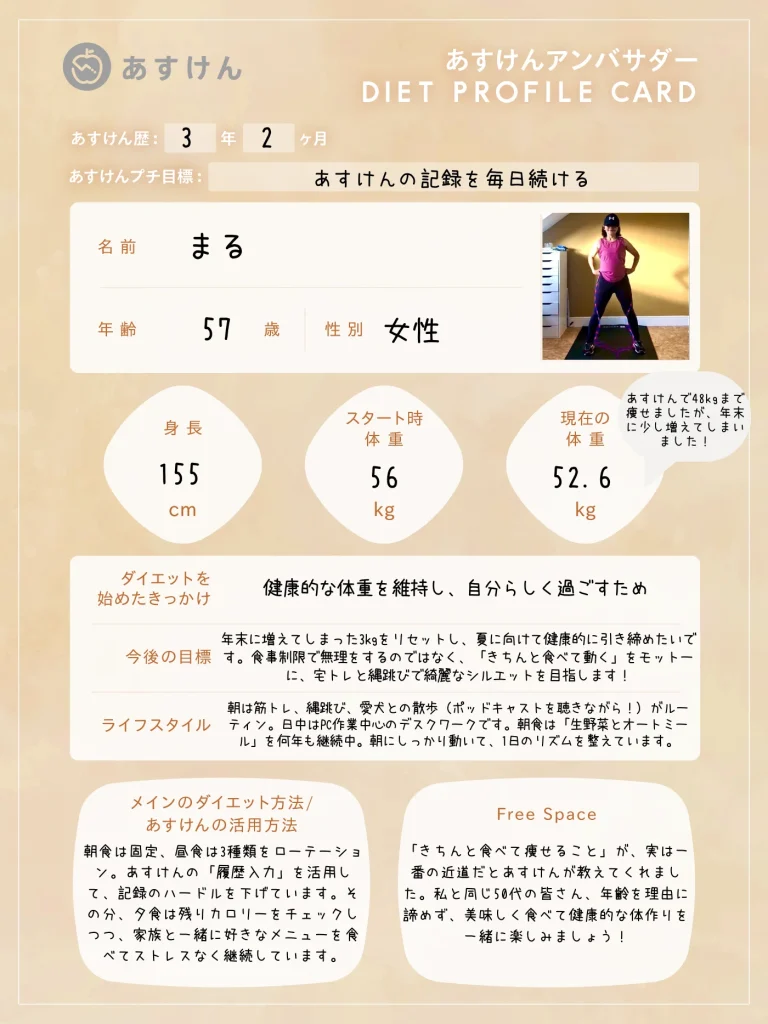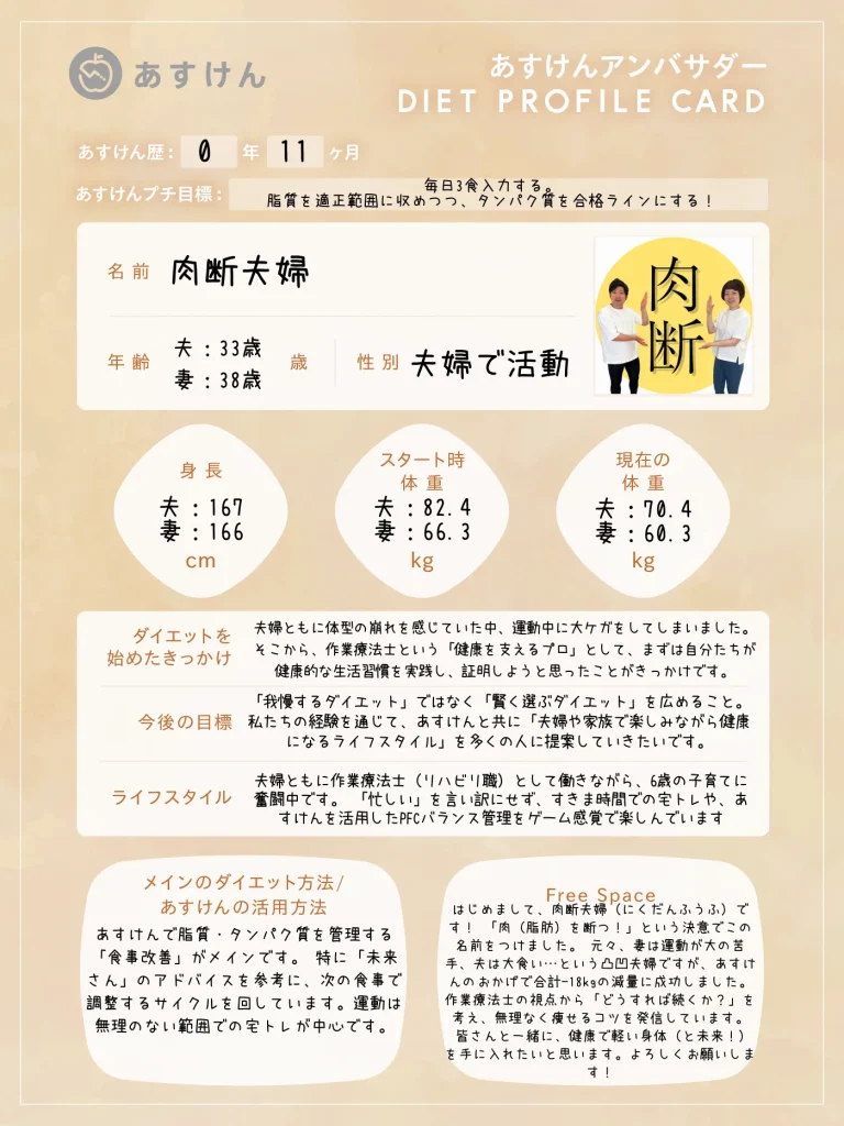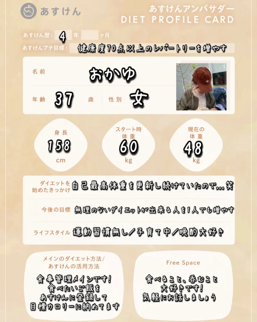 それぞれのSNSアカウントから、あすけんを活用したリアルな食事記録やダイエットの工夫、日々の暮らしを発信していきます。ぜひフォローして、一緒に楽しく健康作りを頑張りましょう!