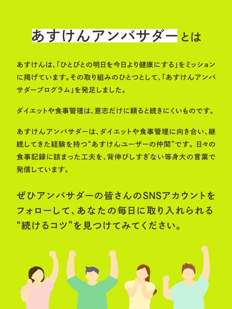あすけんでは、日々のダイエットや健康的な食事の工夫をたくさんのユーザーさんに届けたいという思いから、「あすけんアンバサダー」を募集しました。