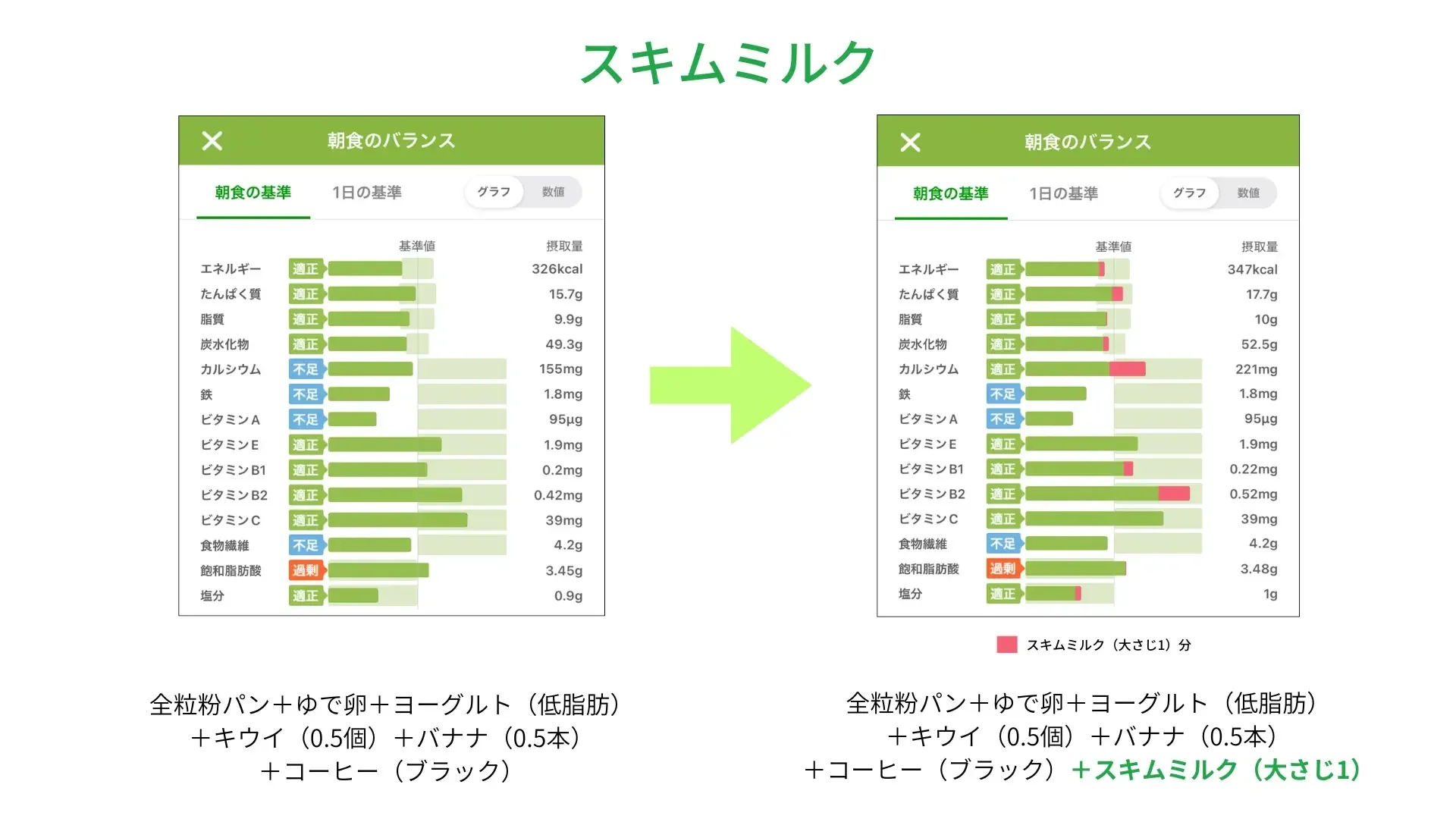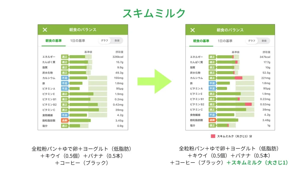 スキムミルクは、牛乳から脂肪分を取り除いて粉末にしたもの。牛乳や豆乳と比べて、100gあたりのカルシウム含有量が圧倒的に多いのが特徴です。コップ一杯分(スキムミルク21g+水179g)で約230mgのカルシウムが摂れます。牛乳だと脂質やカロリーを摂りすぎてしまうことがありますが、スキムミルクはこれらを抑えられます。