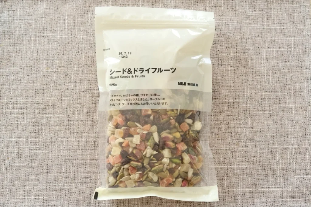 角切りのドライフルーツはほどよい甘みと独特の歯ごたえがあり、シード類はポリポリとした香ばしい食感が楽しめます。素朴な味わいで、一粒ずつゆっくり食べると少量でも長く味わえます。プレーンヨーグルトにトッピングしてもおいしく食べられますよ。