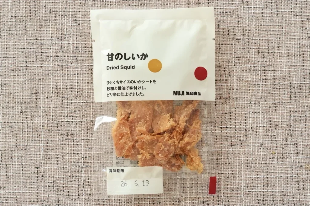 シート状に加工したいかをしょうゆと砂糖で甘じょっぱく味付けした、ほんのりピリ辛風味のおやつ。一切れがひとくちサイズで食べやすく、噛むほどにいかのおいしさがしっかり感じられます。1袋39kcalでたんぱく質が4.0g含まれており、食べきりサイズなので小腹対策として常備しておきたい一品。ベタつきがなく手が汚れないので、外出先でも気兼ねなく食べられます。