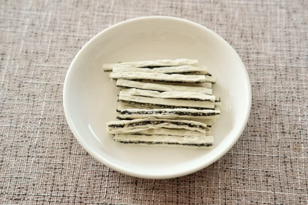 魚肉シート部分は噛むほどにうまみが出てきて、じっくり噛み続けたくなります。プチプチと香ばしい黒ごまの風味が魚のうまみとマッチして少量でも満足感があります。実際に夕食後、少しだけ口さみしくなったときに温かいお茶と数本合わせて食べてみたところ、しっかり満たされた感覚が得られました。小腹対策のおやつとして、ぜひ試してみてください。
