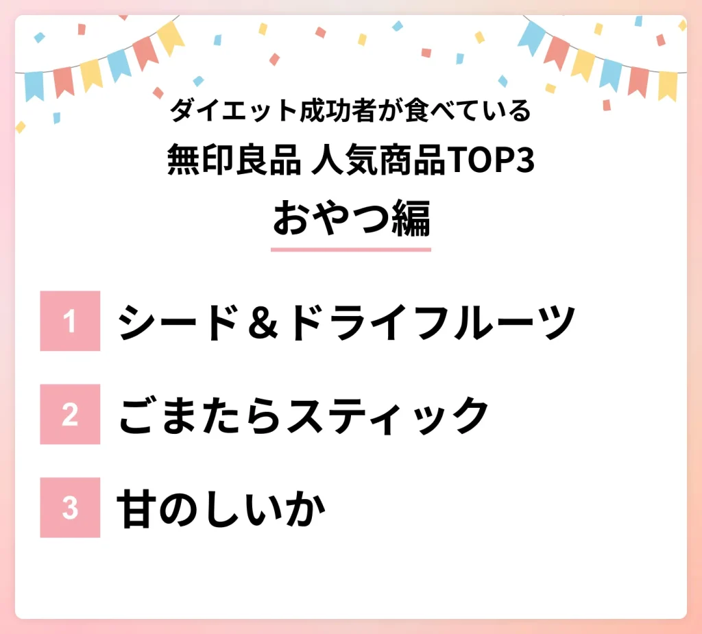 ダイエットに成功したあすけんユーザーの喫食データから、あすけんに多く食事登録された商品をランキング形式で発表!今回は無印良品の人気おやつを紹介します。噛みごたえがあり、少量でも満足できるおやつがランクインしました。