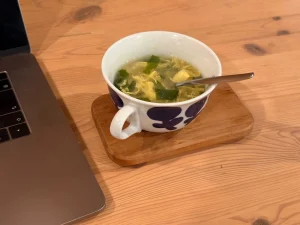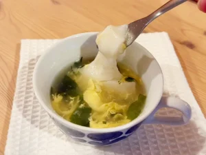 出来上がりはこんな感じで、お餅もちゃんと柔らかくなります。「ふんわりたまご」のスープは、かきたまとわかめが入っており、ほっとする味です。温かい汁をゆっくり飲みながら、お餅を噛んで食べるので、お菓子よりも「食べた感」を感じやすくていいと思います。