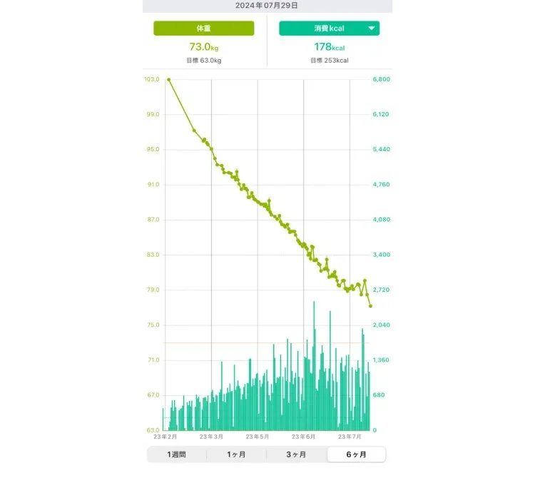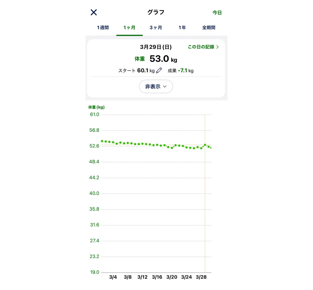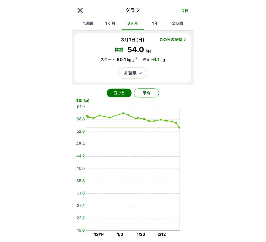 体重記録の何がいいって、グラフで変化が一目で分かること。何となく測っていると「減ってる!」「あれ、増えたかも…」と一喜一憂しがちですが、継続的に体重を計測すると「ちゃんと減ってる」が実感できるんです。