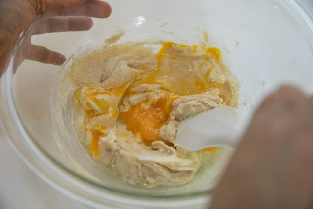 2. 卵を1個ずつ加え、その都度混ぜる。