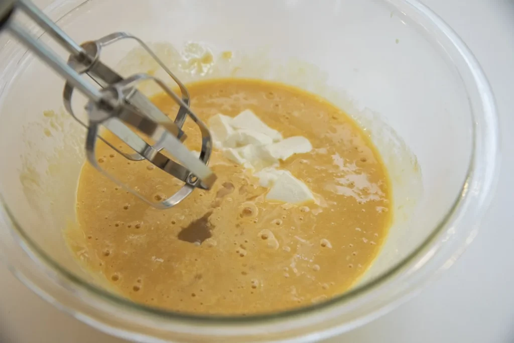 3. レモン汁、ギリシャヨーグルトを加え、電動泡立て器でダマがなくなるまで混ぜる。