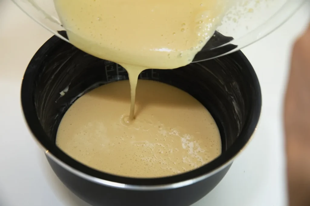 5. 炊飯器の内釜に薄くバターを塗る。4を流し入れ、通常炊飯で炊く。竹串を刺して生の生地がついてこなければできあがり。