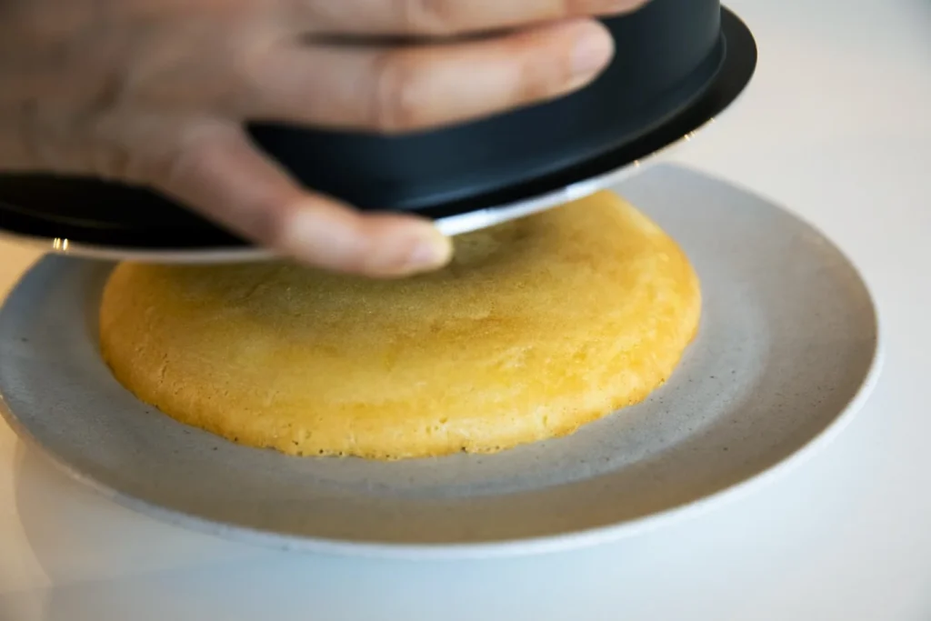 6. 熱いうちに内釜を外側から軽く叩き、取り出しやすくする。粗熱が取れたら皿をかぶせ、ひっくり返して取り出す。冷蔵庫で3時間以上冷やす。