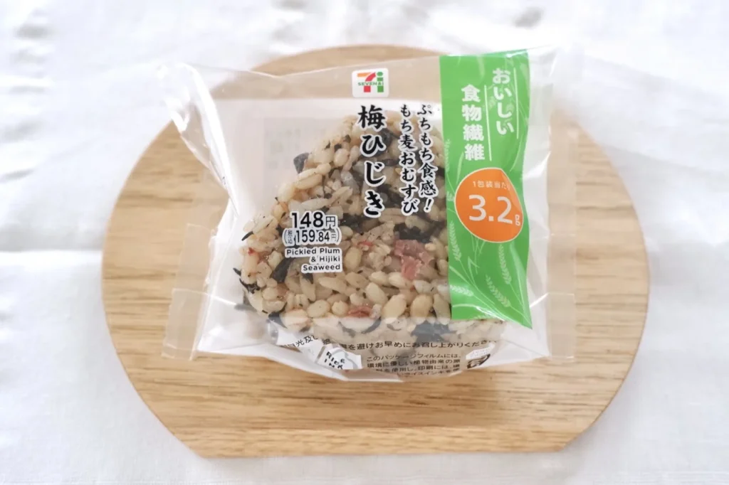 もち麦ご飯にひじき・梅・赤しそ・ごまを混ぜ込んだおむすび。食物繊維は3.2gと、今回紹介する3商品のなかで最も多く含まれています。