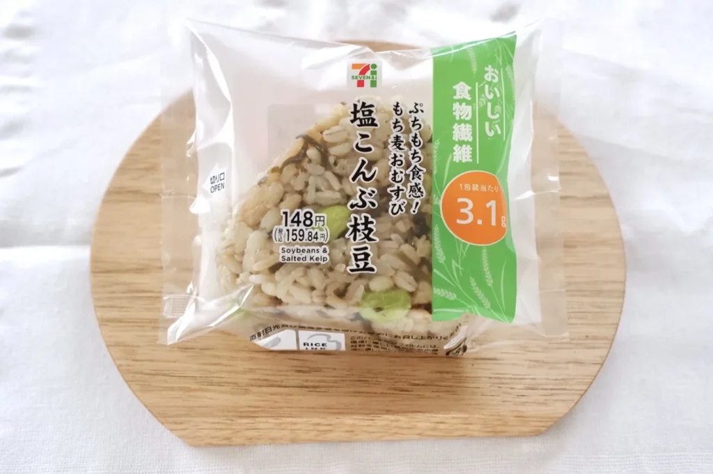 もち麦のぷちぷちとした食感と、塩こんぶ・枝豆・ごま油が混ぜ込まれた混ぜおむすびです。枝豆でたんぱく質、もち麦で食物繊維が摂れるのがうれしいポイント。たんぱく質が4.7g、食物繊維が3.1g含まれています。