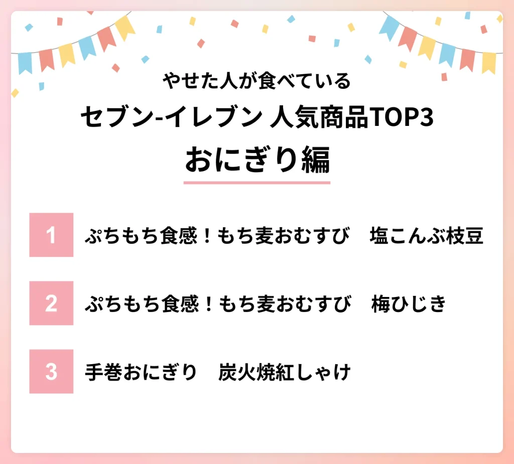 ダイエットに成功したあすけんユーザーの喫食データから、あすけんに多く食事登録された商品をランキング形式で発表!今回はセブン‐イレブンの人気おにぎりを紹介します。