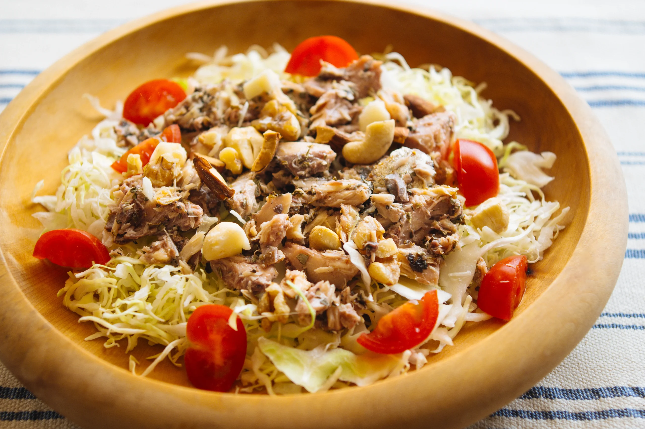2. 器に千切りキャベツを盛り、1のサバ水煮とプチトマトをのせ、ミックスナッツをかける。