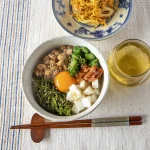 3. 2に1を広げてのせ、さらに温泉卵をのせる。