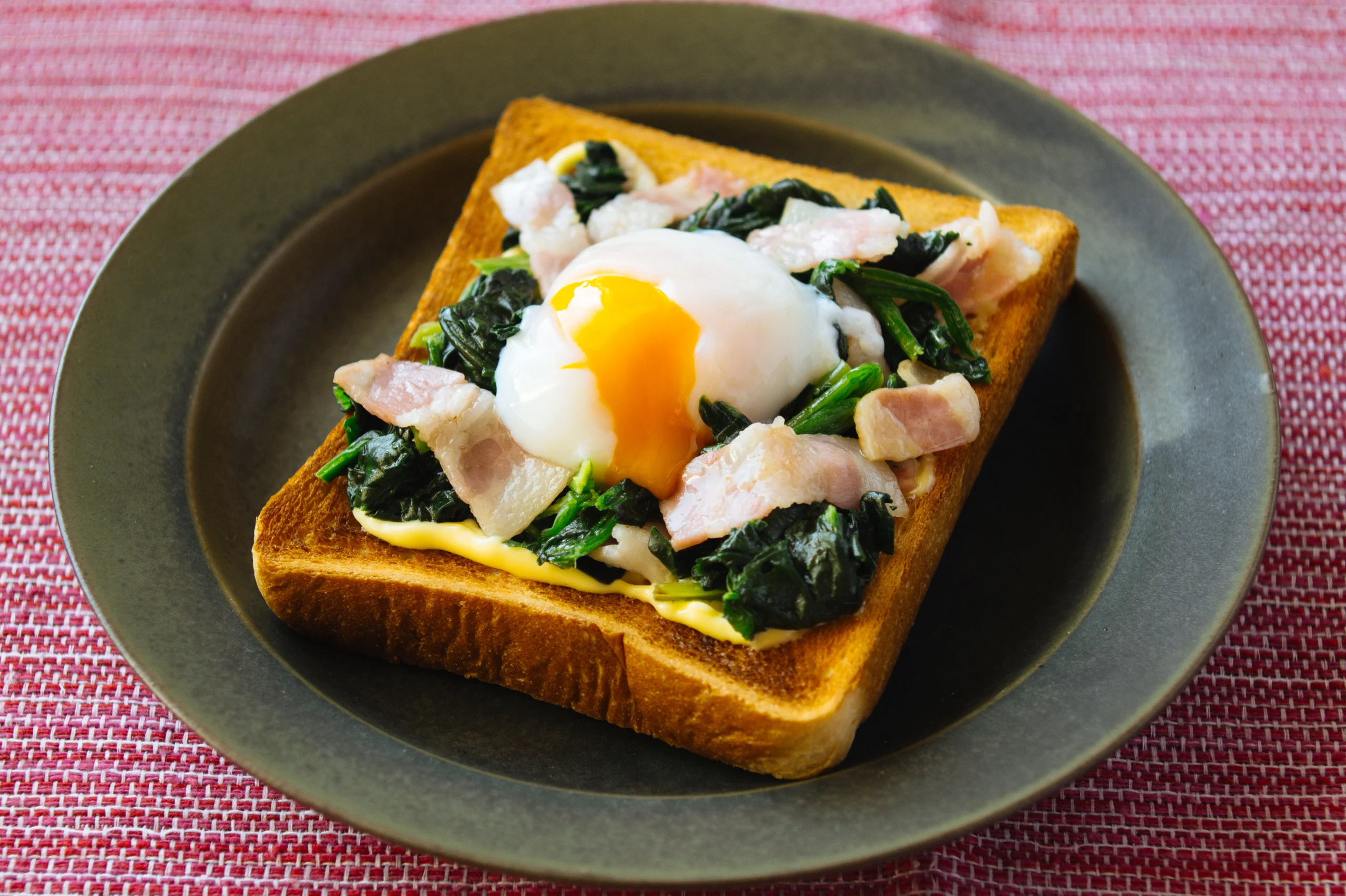 1. ベーコンは1cm幅に切る。オリーブオイルを引いたフライパンでニンニクを熱し、ベーコンと冷凍ほうれん草を加え、塩で味つけしながら炒める。