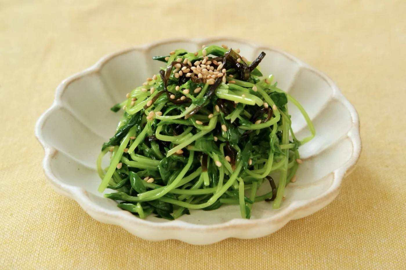 3. 別のボウルに塩昆布とごま油を入れ、加熱した豆苗を加えてあえる。